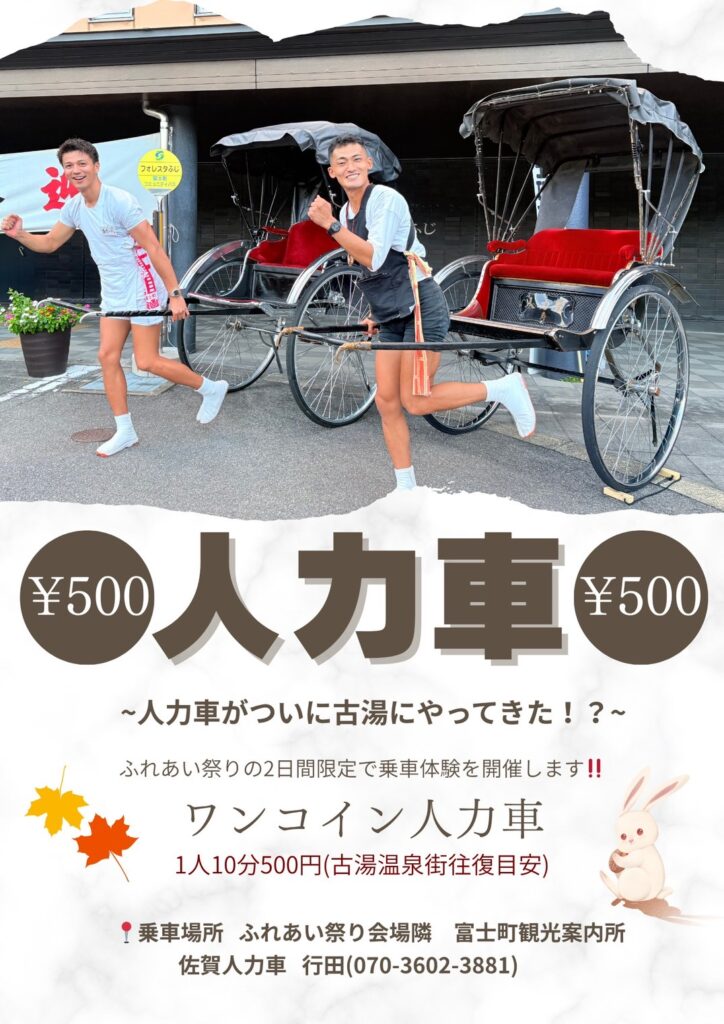 ふれあい祭りの開催と同じ週末、古湯温泉のまちなかに、なんと 「人力車」 が登場します!